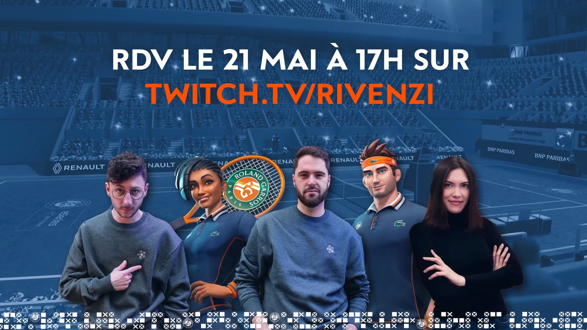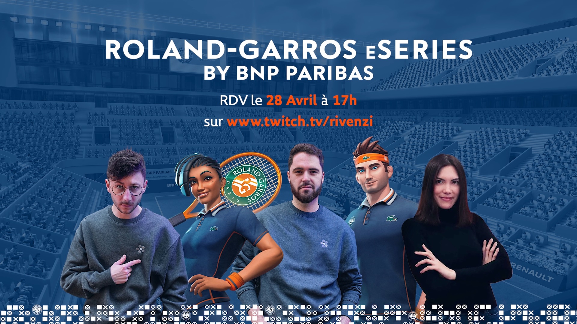 RG eSeries by BNP Paribas 2022 : RDV sur Twitch le 28 avril !Rendez-vous le 28 avril à 17h sur la chaîne Twitch de Rivenzi pour un stream des étapes de qualification des Roland-Garros eSeries by BNP Paribas 2022.